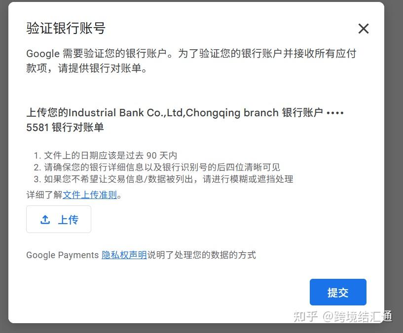 1.首次绑定收款账户后,Google 会要求上传银行对账单以验证账户真实性。
